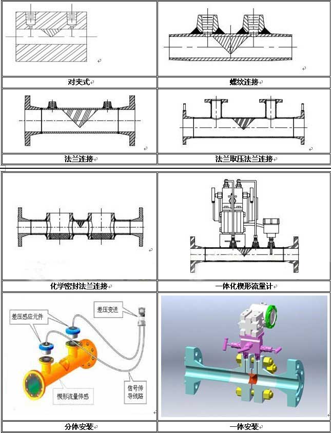 LX楔形流量計(jì)按其組裝方式分為一體型和分離型,按其連接方式分為法蘭連接、焊接連接、螺紋連接及對(duì)夾式連接,按其取壓方式分為普通取壓、法蘭密封取壓等結(jié)構(gòu)。詳見(jiàn)下表: